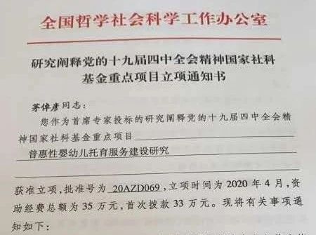 茅倬彦教授作为首席专家申报的项目为“普惠性婴幼儿托育服务建设研究”(批准号,20AZD069),该项目将围绕我国普惠性婴幼儿托育服务发展的基础性理论问题和服务标准问题开展研究,旨在为推进我国托育事业发展提供理论支持和数据支撑。
