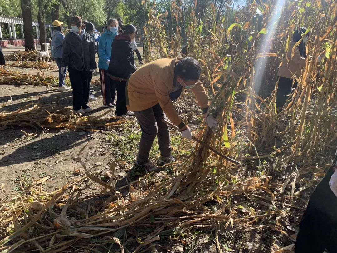 首先进行第一项农务劳动——割玉米杆,工作人员为大家仔细地介绍了如何安全正确地使用劳动工具,并分配了各小组的劳动任务。每组同学内部分工有序,各组同学之间暗自较劲,虽然风很大,但也没有吹散同学们劳动的热情,场面热火朝天,驱散了秋日的寒冷。