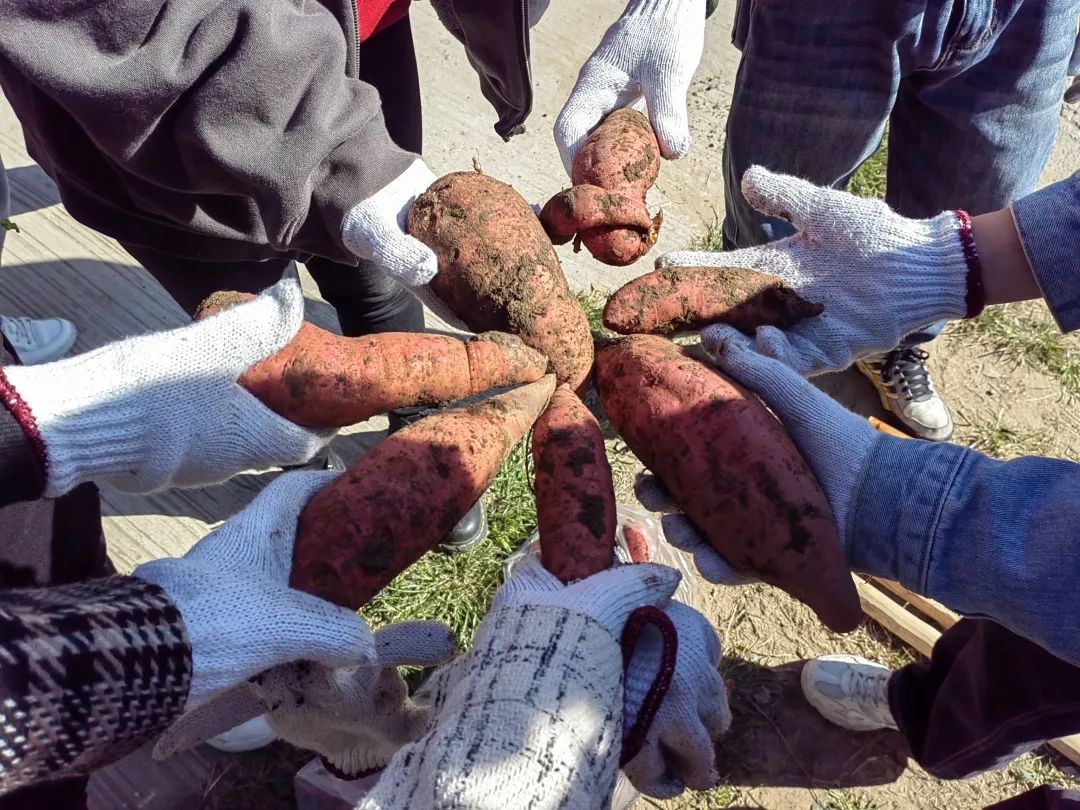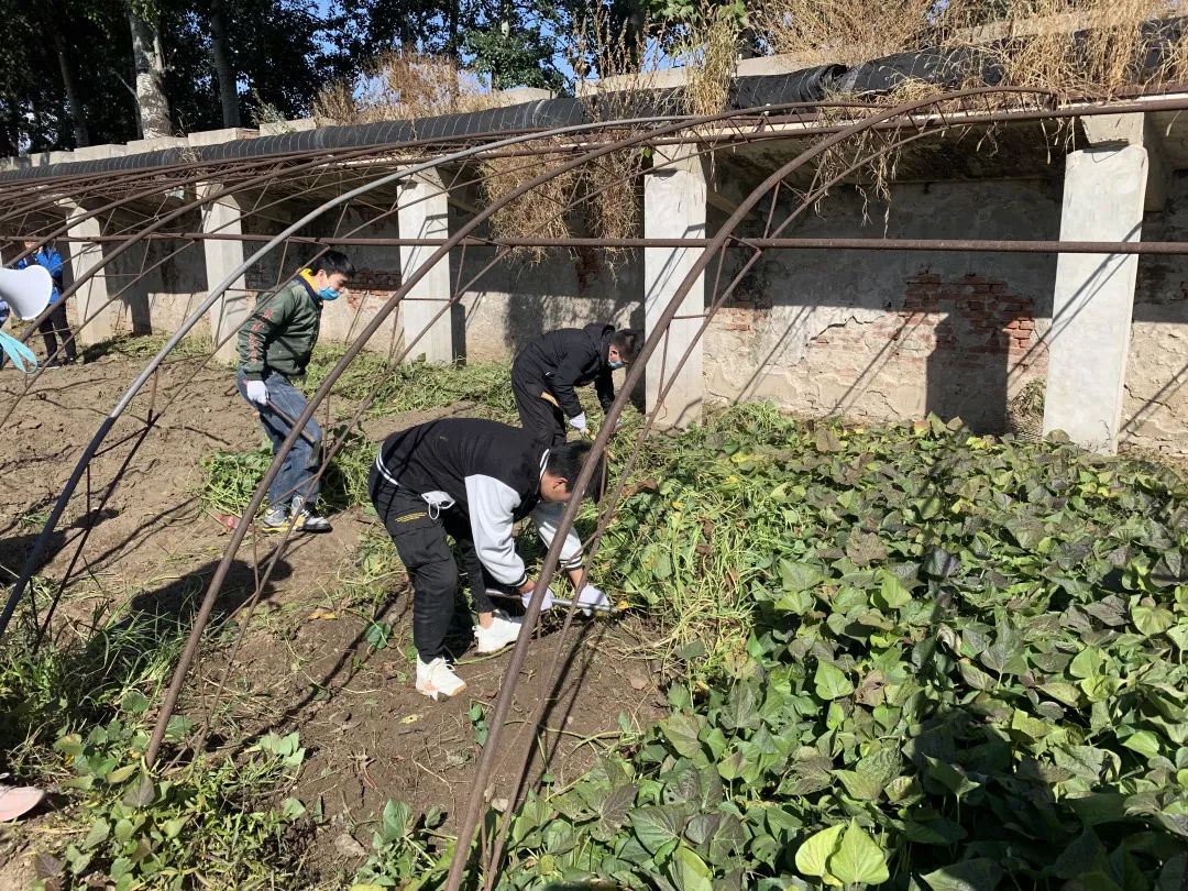 随后,同学们来到了红薯地继续进行劳作。工作人员为大家做了简单的示范,三位男同学率先把表面的红薯藤割完,一些带梗的红薯就在光秃的土地中若隐若现。起初在挖掘红薯的过程中,大家技术动作不够熟练,导致挖断红薯情况发生,随着不断地摸索和积累经验,失误越来越少,每组同学都收获颇丰。劳动是一个熟能生巧的过程,同学们在这次劳动中充分体会到了粮食的来之不易。