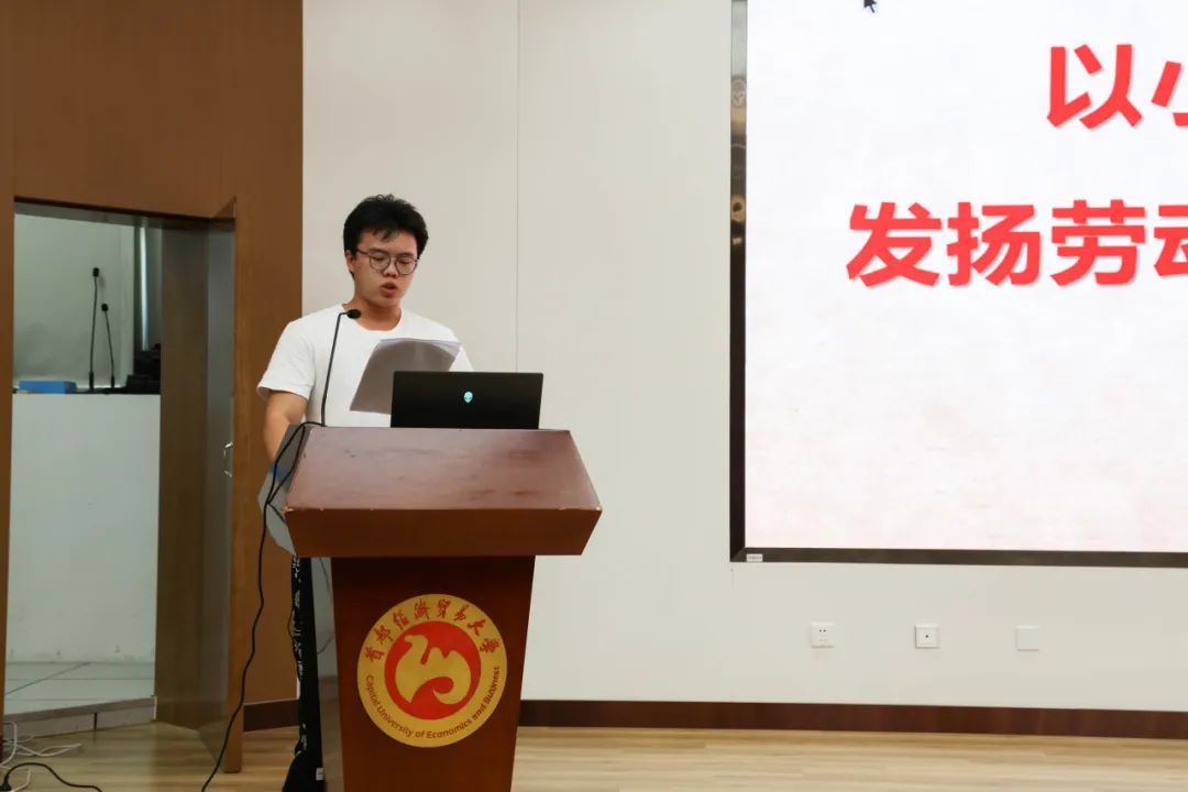 开场环节,学院兼职辅导员王子铮从劳经历史传承切入,鼓励同学们从学科发展中汲取“顶天”养分,从社会实践中培养“立地”本领,通过四年大学生活的锤炼铸就绚丽多彩的青春。