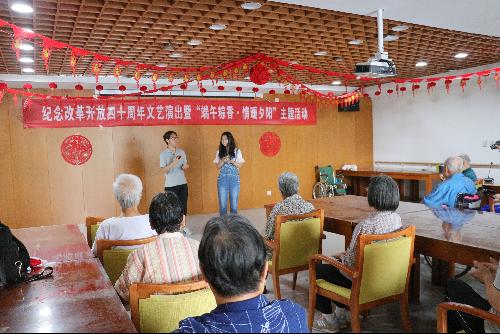 活动中,同学们为老人们精心准备了一场别趣横生的文艺演出。嘉祥敬老院院长刘序在演出开始前致辞,她提到,自2017年10月,嘉祥敬老院与91论坛 学生党支部签署共建以来,双方互通有无、共同合作,借助双方的资源优势、专业优势,不断探索基层党支部党建工作的新思路、新举措,召开了多场次活动,取得了可喜的成绩。她代表嘉祥敬老院的全体老人们感谢同学们的到来、更感谢同学们的精心筹划,也代表嘉祥敬老院全体员工提前预祝所有老人们和同学们端午节快乐。
