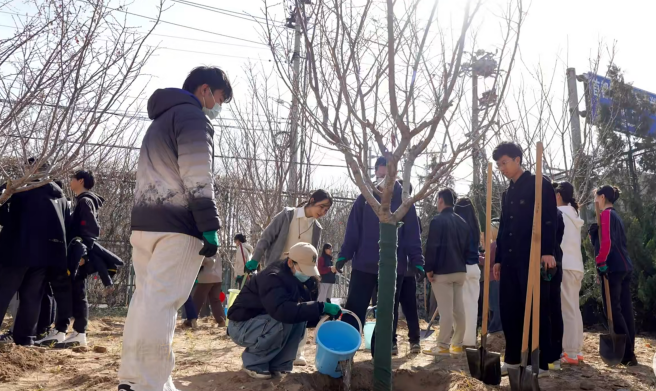 植树节当天,第二届“经贸花开”植树活动如期开展。在后勤老师们的指导下,同学们挥锹铲土、培土围堰、提水浇灌,将一棵棵樱花树苗种在琢玉礼堂外的花圃里。青春在劳动的热浪中澎湃,汗水于校园的土地上挥洒,每一分耕耘都迸发出蓬勃的希望。
