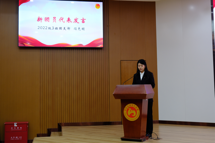新团员代表闫竞颐发言。她回顾过去,结合在入团过程中自身的成长和对团组织的认识和向往等方面进行了分享,同时也对未来进行了展望,希望在未来可以坚定奋斗的决心,更加严格要求自己,为组织的建设贡献自己的青年力量。