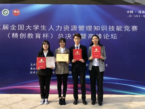 2018年11月3-4日,第三届全国大学生人力资源管理知识技能竞赛总决赛(精创教育杯)在山东青年政治学院举办。由我院安书慧、高歌、陆宣先以及工商管理学院石俊豪四位同学组成的91论坛 代表队,荣获大赛一等奖、“知识技能竞赛优胜奖”,边文霞副教授荣获“优秀指导教师”奖。