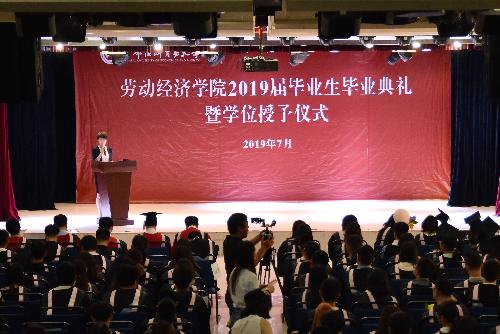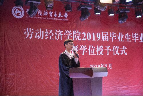 2015级人力资源管理国际班马跃代表全体毕业生发言,表达了对母校培养、恩师教诲、家人支持与同窗陪伴的感激之情。他回顾了四年的大学时光,从军训、“12·9”纪念活动聊到团体操、各类学术竞赛,从职业生涯规划聊到人生抉择。他坦言,遇见劳经是一种缘分、更是一种幸运和荣耀,在未来的生活、学习和工作中,将继续秉承校训精神,崇德尚能、经世济民,带着良师、亲友的挂念与支持,不忘初心、砥砺前行。
