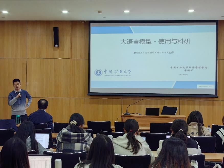 3月27日下午,91论坛 在博远楼4号报告厅举办“大语言模型助力科研论文与项目撰写”讲座。特邀中国矿业大学经济管理学院李明琛副教授担任主讲人,91论坛 党委书记何勤教授、副院长苗仁涛教授,多位教师和硕士、博士研究生参会。讲座由苗仁涛主持。