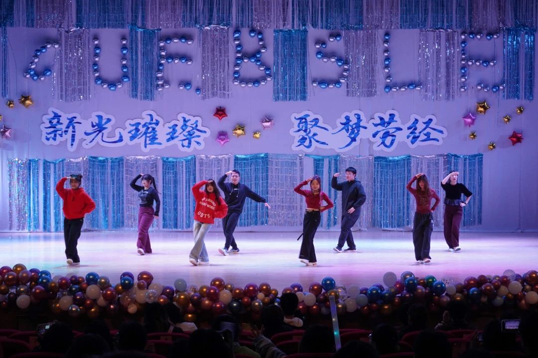 欢呼声与掌声未落,九位劳经学子在绚丽的光影下跃动着优美流畅的舞步登场,仿佛浩瀚星河中划过天际的流星,为观众们带来全新的视听盛宴,动感洋溢的舞姿饱含着对未来的真诚期许与执着追寻。