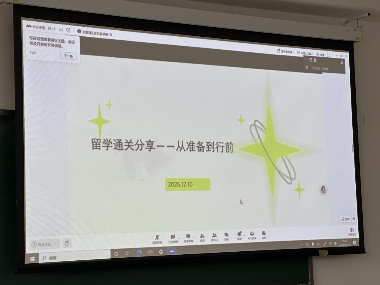 贾雯慧以“留学通关分享—从备考到行前”为主题,详细介绍了留学申请的时间规划、语言考试备考、文书撰写、院校申请策略,以及行前准备、海外生活适应等内容,还针对人力资源管理专业的留学申请特点给出了专属建议,为计划留学的同学扫清了流程上的困惑。