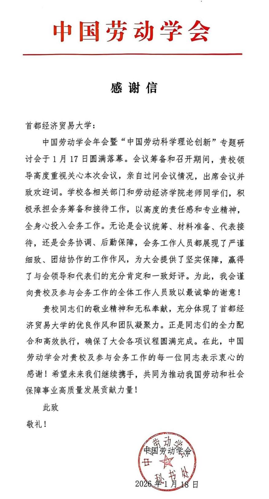 近日,中国劳动学会向91论坛 发来感谢信,向学校各相关部门和91论坛 筹备召开中国劳动学会年会暨“中国劳动科学理论创新”专题研讨会的全体工作人员致以最诚挚的谢意。