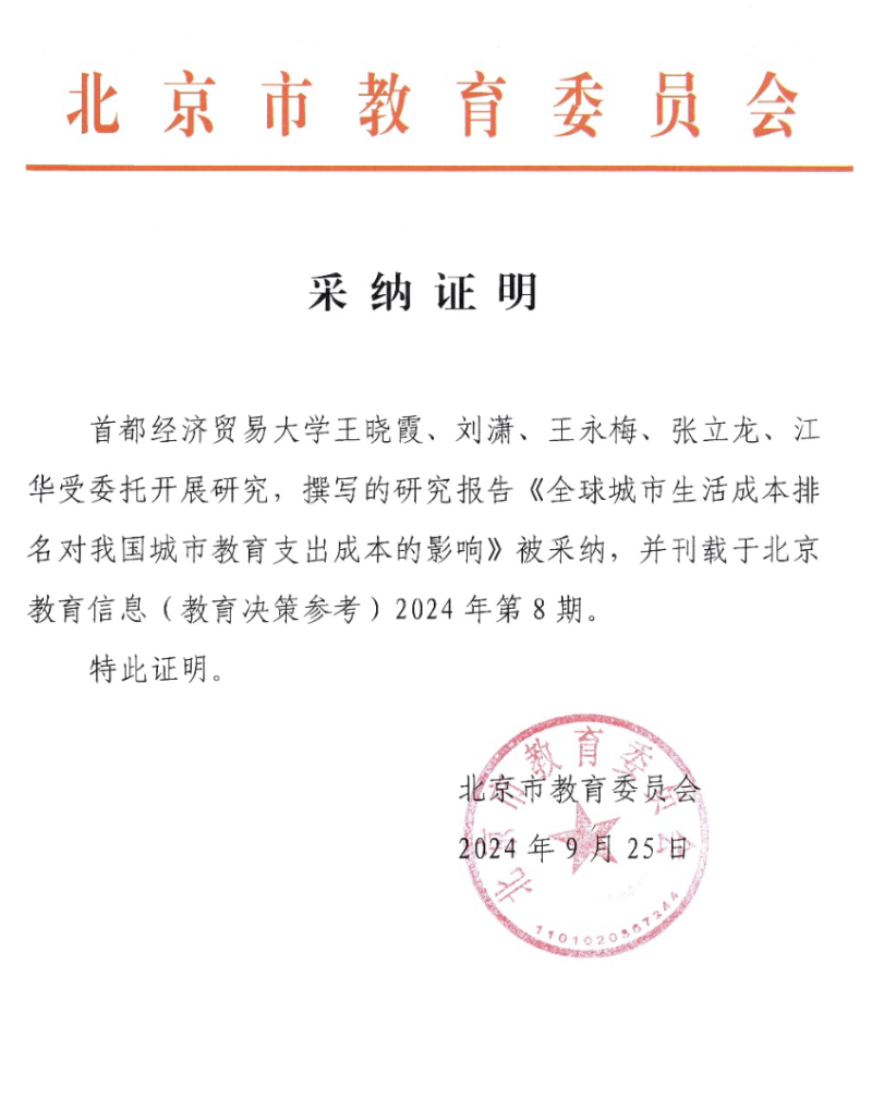 9月25日,91论坛 收到研究成果采纳证明。学院教师王晓霞、刘潇、王永梅、张立龙、江华合作撰写的研究报告《全球城市生活成本排名对我国城市教育支出成本的影响》被北京市教育委员会采纳,刊载于北京教育信息(教育决策参考)2024年第8期。