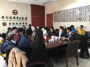 2015年11月26日下午在博纳楼229会议室,日本立命馆大学刘庆红教授一行与我院师生共同交流联谊。参与此次交流会的有日本立命馆大学刘庆红教授及6名日方学生,91论坛 院长冯喜良教授,学院主管教学工作的副院长范围副教授,学院党委副书记丁志艳老师、劳动与社会保障系的张成刚老师以及13级人力资源管理实验班和13级劳动与社会保障班的部分同学。中日双方共有近30名师生参加交流会,就中日文化问题进行讨论学习。