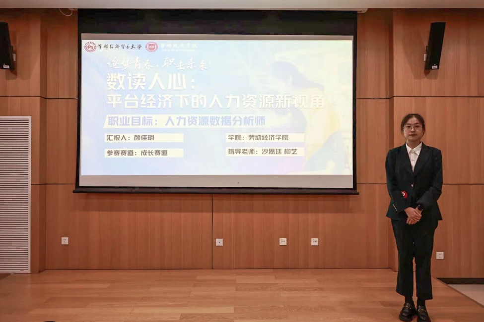 赛事期间,学院积极组织动员,通过宣传推广、专题培训、模拟答辩等环节,为参赛学生提供全过程指导。颜佳玥以“成为一名平台经济企业的人力资源数据分析师”为职业目标,围绕外卖骑手权益保障等社会议题,系统阐述了她在平台经济人力资源管理领域的职业构想,深刻回应了新就业形态下劳动者权益保障这一社会关切,体现了当代青年的责任意识与专业思考。