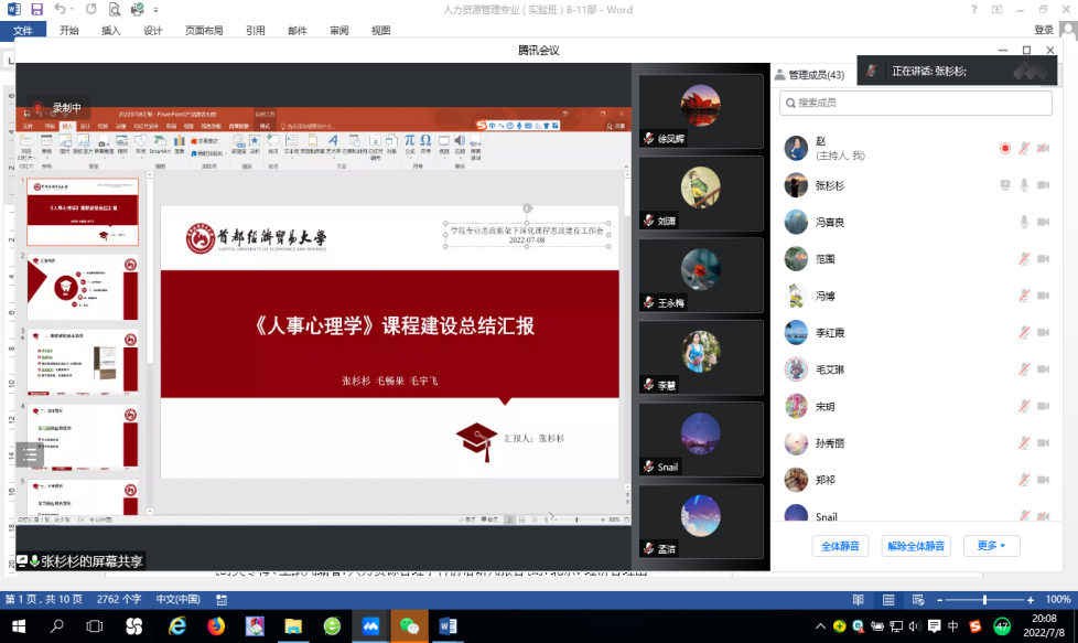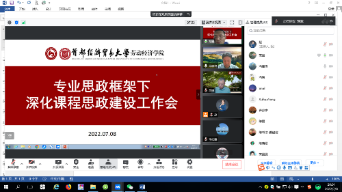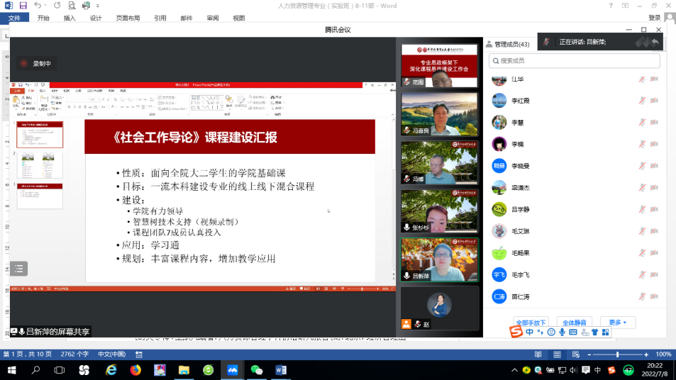 首先,由2021-2022学年承担学院在线课程建设项目的老师汇报课程建设的成效及其未来规划。张杉杉老师汇报《人力资源管理心理学》课程建设情况,该课程共计录制了50个教学视频,活动数达16586次,并修订教材第4版,形成308道题库,张杉杉老师最后提到学习通在线课程在与学生沟通、与老师之间沟通的便利作用。该课程的课件荣获北京市优质本科课件。吕新萍老师汇报《社会工作导论》课程的建设情况。课程主要围绕一流本科建设专业的线上线下混合课程的目标展开,在团队7人认真投入的情况下,丰富了课程内容。郑祁老师汇报《劳动关系学》课程的建设情况。课程总录制时长达550分钟,分为了59节,并分享了在线课程录制过程中将思政元素融会贯通的教学心得。周施恩老师汇报《人力资源管理导论》课程建设情况,并提出将思政元素融入课堂教学,形成91论坛 特色交叉课程的未来展望,该课程荣获了北京市优质本科课程。江华老师汇报了《社会保障基金管理》混合金课建设的情况。该课程的整体定位为线上学知识,线下长能力。江老师以具体课程为例,详细介绍了如何将思政元素融入课堂,推进课程思政建设的经验。