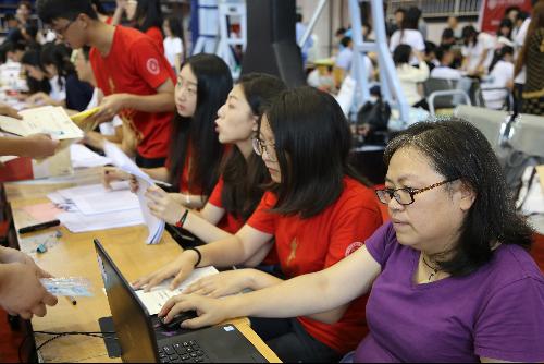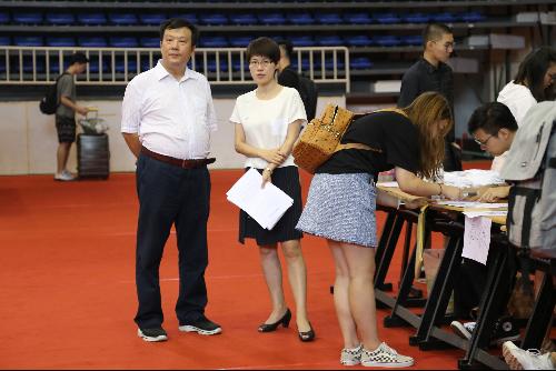 上午七时许,学院各新生班级班主任、班级助理以及学院学生组织部分成员来到体育馆内精心布置迎新摊位,再三核对应发资料、核实新生报到资料、确认学校各项通道和服务台的具体位置,精神饱满地等待着新面孔们的到来。