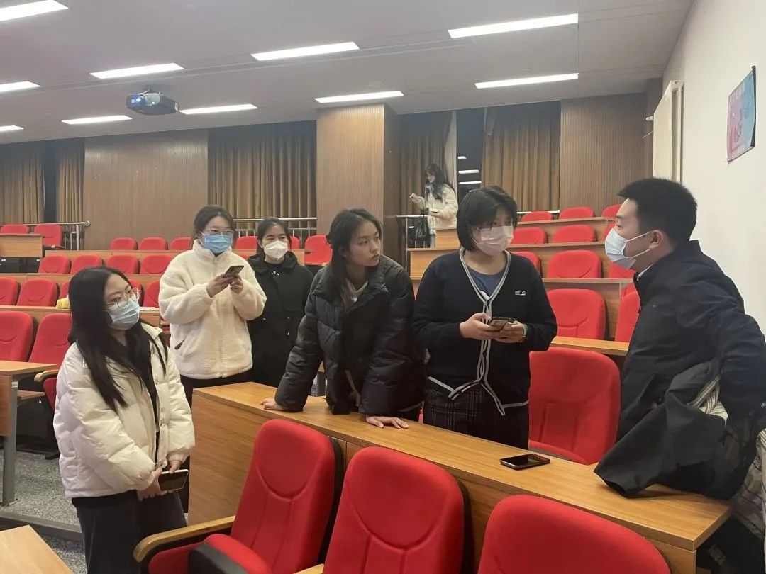 讲座结束后,同学们仍意犹未尽,围在学长身旁,就自己在岗位选择、复试备考等过程中遇到的问题进行提问,学长耐心细致地为同学们一一做出解答和建议。