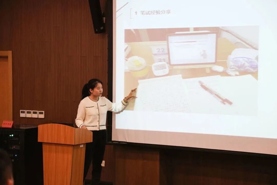 接着,学姐就自己上岸入职后的经历与感受与大家进行了分享,总结了自己一路从学生到公务员的身份转变和心得体会,以及对于公务员“为人民服务”这个根本任务的解读和感悟,并对学弟学妹们提出了鼓励和期冀,希望学弟学妹们能够端正思想,不忘初心,肯吃苦,能奋斗,一旦下定决心就不要后悔。