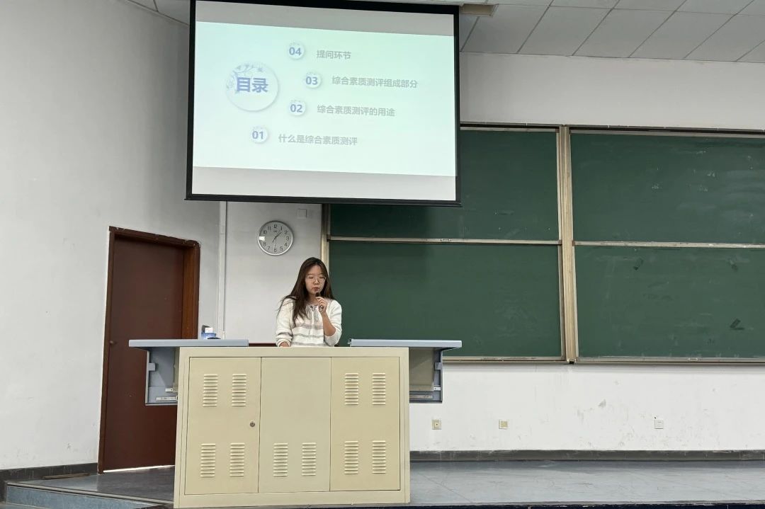 在同学们基本认识综合素质测评下,孙小淇为同学们进一步详细介绍测评内容构成以及各个组成部分的具体评分方法,其中包含基础性素质测评和发展性素质测评两大部分,同时提示同学们要以学业为前提基础的情况下,积极参与学生工作、学科竞赛和校园活动,寻求全方面发展。