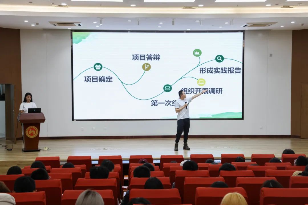 两组暑期社会实践团队进行展示,分享他们扎根实践的经验与感悟。“发扬劳动精神,赓续红色血脉”红色劳经宣讲队项目组长范明哲,为大家介绍了团队构成、项目主题与流程以及其中具体活动的设计。他们希望通过此次活动讲好劳经故事,并将实践中获得的知识与经验变成未来学习上的推手。“乡村里的艺术范儿”艺术融合视角下的乡村振兴路径研究项目组韩珈航、黄咏菲,为大家分享了项目的背景、活动设计中的一些细节、以及实践过程中的趣事与收获。他们通过这次活动更加深入的认识了新时代农村面貌、乡村振兴,并希望在以后的学习生活中更好的领悟新时代赋予大学生的社会责任。“纸上得来终觉浅,绝知此事要躬行”劳经学子们在实践中淬炼自己的青春,将学院的精神散播到更广阔的天地。