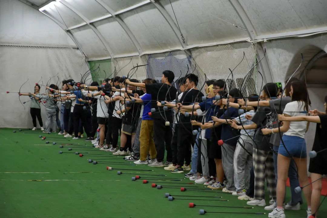 在之后的“攻防箭“项目中,教练带领大家进行分组热身,熟悉道具,掌握正确的护具佩戴方式与拉弓射箭的注意事项,避免失误受伤。热身完毕佩戴好护具后,三组轮流进行对抗赛。两队在规定的区域内相互射击,团队分工明确,有人发射进攻,有人掩护防守,通过这样的体育竞技,在强化专注度的同时,学会分工与合作,从而提升团队的凝聚力,培养同学们的沟通、协作以及应变能力,培养团结奋进,同心向前的团队精神。