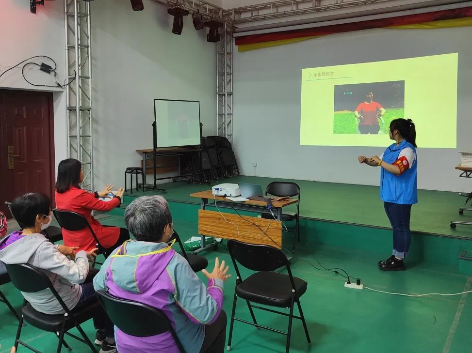 健康知识普及环节后,22级劳经班的荆宝竹带领老年朋友们学习手指操。雷宁、曾菀晴、彭森、刘鑫几位同学走到老年朋友们身边跟他们一起练习。通过跟随着志愿者们一步一步的练习,大家的筋骨得到了舒展,缓解了疲劳。