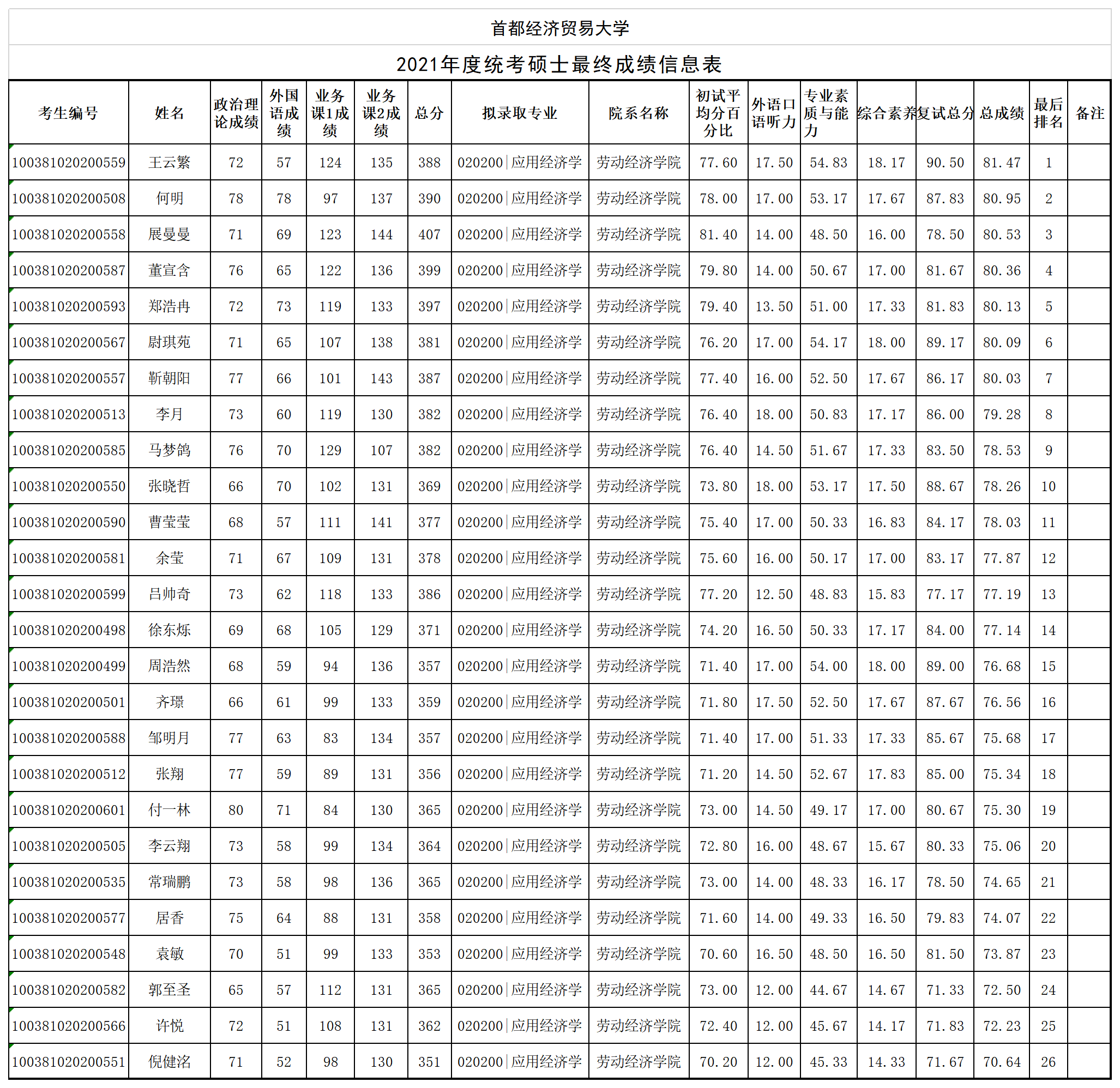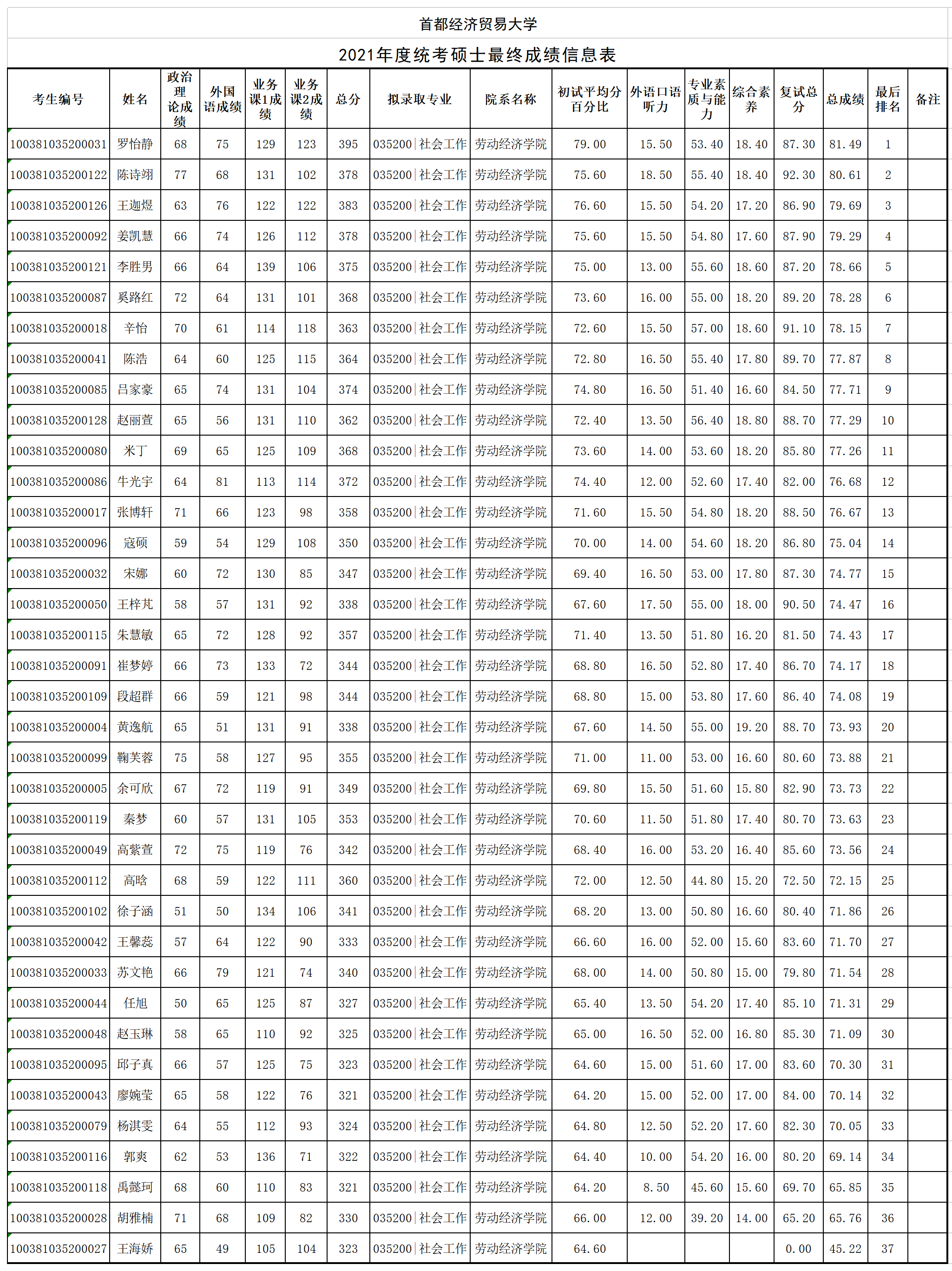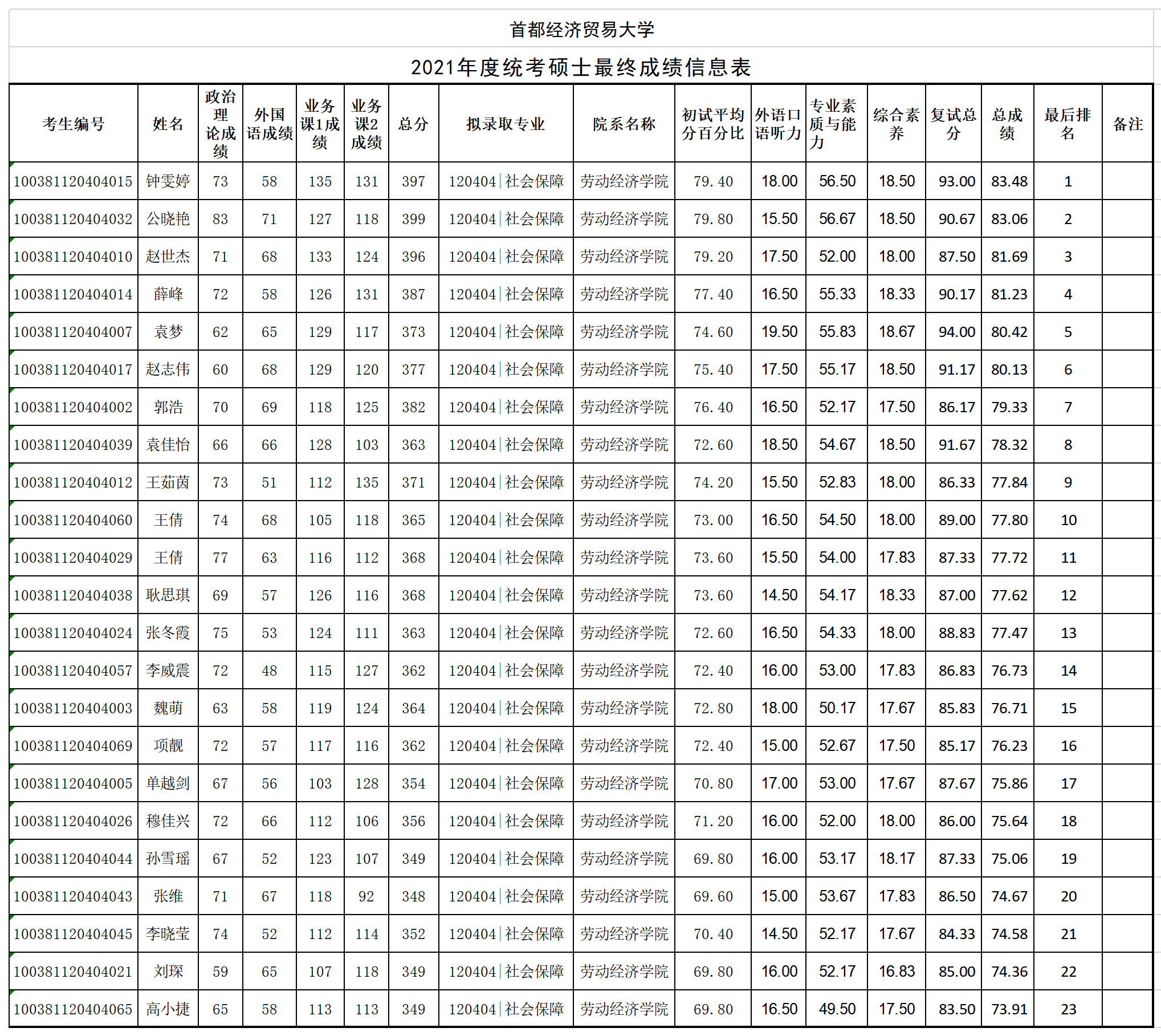【公示】首经贸91论坛 2021年度统考硕士最终成绩公示